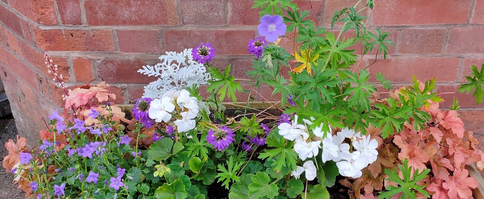 Christine chose Ammi Visnaga and Black Millet along with Lavender and Geraniums for the main bed. Betty incorporated Campanula and perennial Geraniums in her planters whilst Karina’s car park long border contained