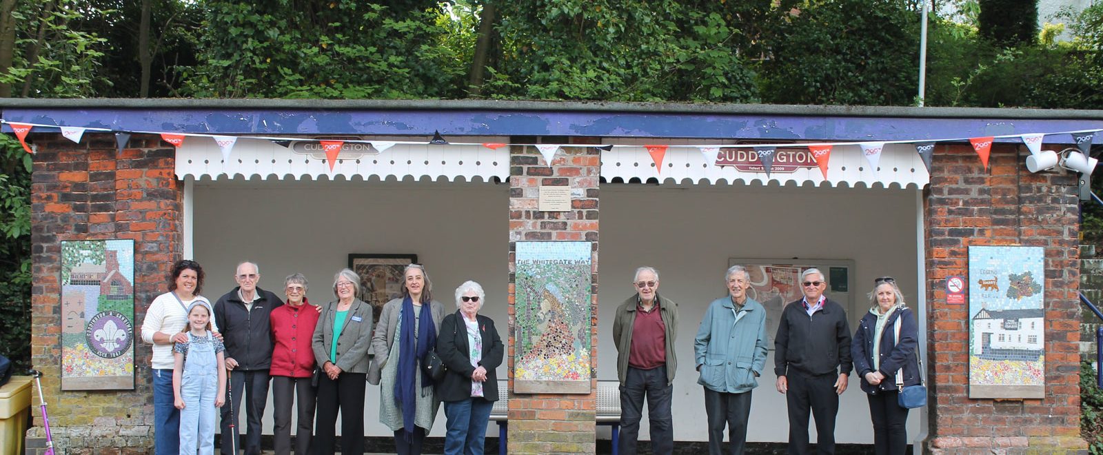 There was a gathering at Cuddington station on Sunday 4th May to celebrate the installation of 3 mosaic panels on the Chester side shelter. The project was driven by Cuddington and Sandiway Youth Club plus pupils from Cuddington and Sandiway primary schools under the guidance of mosaic artist Jan Johnson and project Mgr Beth Barlow. Funding was provided through Northwich Rotary, Cuddington Parish Council and Mid Cheshire CRP