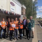 The baton was handed to the next walk leader who took us to Lostock Gralam alongside the rail track with a friendly wave from the signal box operator as we passed. We set off on the final leg towards Northwich station along the roadway. Another great day of walking in the sunshine with people joining and leaving along the way. the baton was carried from Knutsford to Northwich.