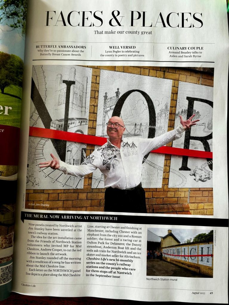 The Northwich Station art panels designed by local artist Jim Stanley have got a mention in Cheshire Life Magazine. Here`s Jim showing off his amazing handy work which features the diverse cities towns and countryside along the Mid Cheshire Line. The art panels were commissioned to celebrate Railway 200 with funding provided by Cross Country,…